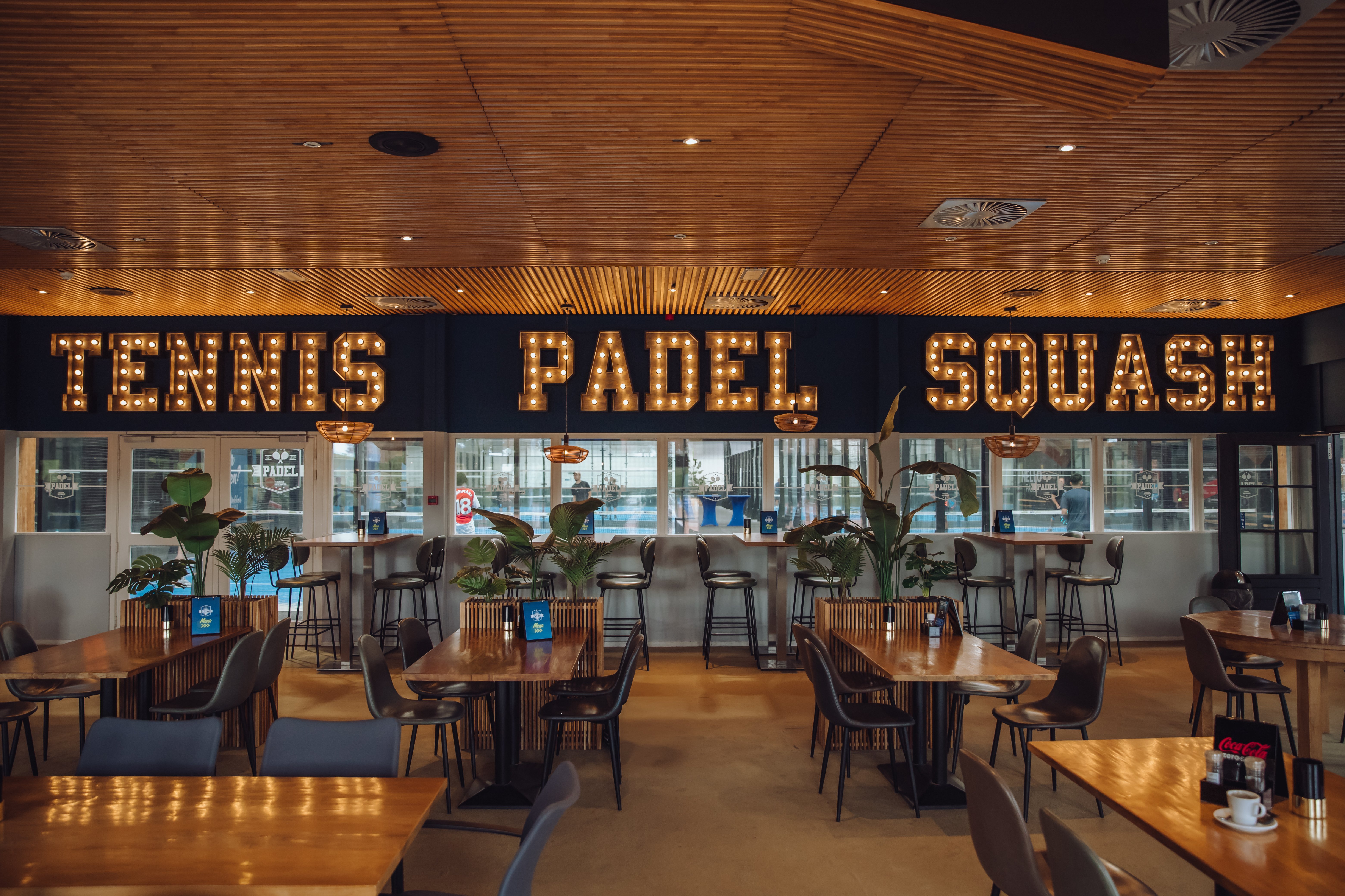 De sfeer is ontspannen, het uitzicht sportief: vanuit de bar kijk je direct uit op de padelbanen en tennisbanen. Je zit dus letterlijk aan het speelveld, met een drankje in de hand.
